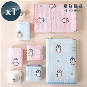 【星紅織品】企鵝家族四層紗布速乾純棉浴巾/童巾/方巾三件套組(粉色/藍色 2色任選)x1組