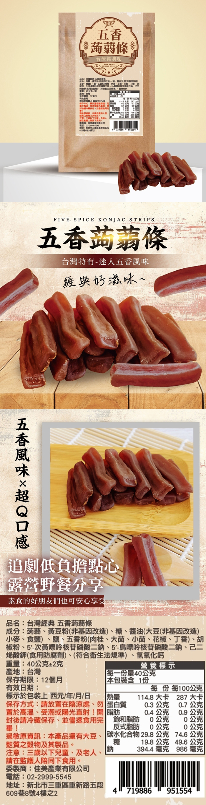 成份:蒟蒻、黃豆粉(非基因改造)、糖、醬油(大豆(非基因改造)小麥、食鹽) 、鹽、五香粉(肉桂、大茴、小茴、花椒、丁香)、胡椒粉、5’–次黃嘌呤核苷磷酸二鈉、5 ’–鳥嘌呤核苷磷酸二鈉 、己二烯酸鉀(食用防腐劑)、(符合衛生法規準) 、氫氧化鈣