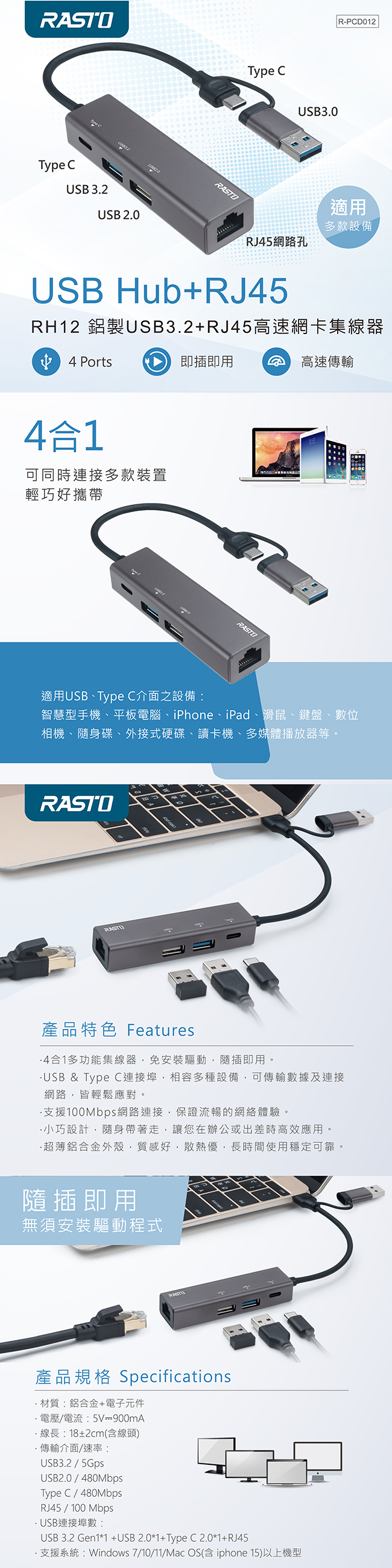 RASTO RH12 鋁製USB3.2+RJ45高速網卡集線器