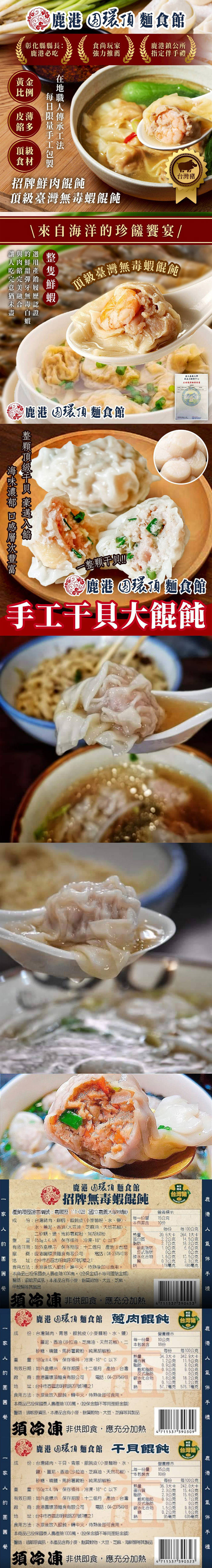 ※干貝餛飩-台灣豬肉、干貝、青蔥、餛飩皮(小麥麵粉、水、鹽)、薑泥、香油(沙拉油、芝麻油、天然花椒)、二號砂糖、精鹽、馬鈴薯澱粉、黑胡椒粉