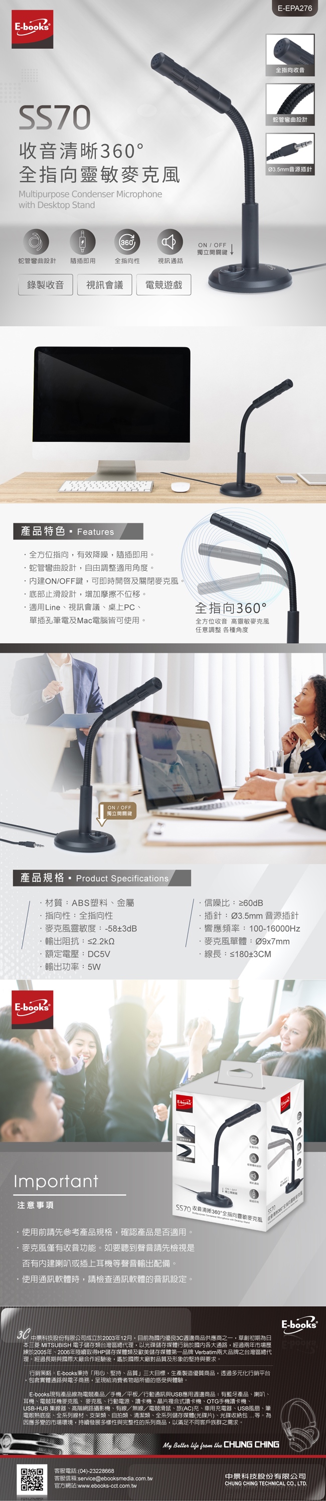 E-books SS70 收音清晰360度全指向靈敏麥克風