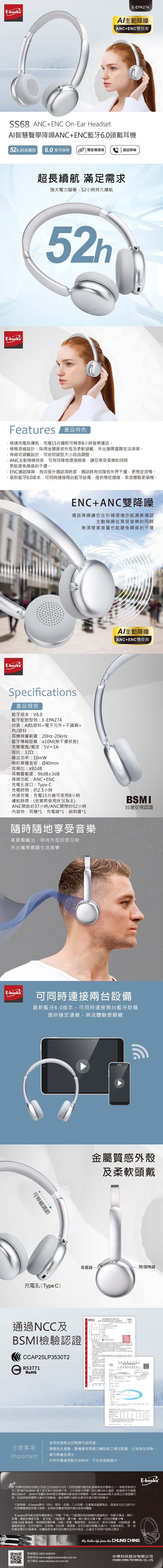 E-books SS68 AI智慧聲學降噪ANC+ENC藍牙6.0頭戴耳機
