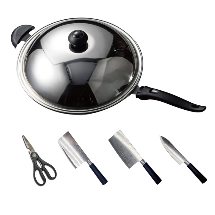 備長炭炒菜鍋36cm+德式工匠級合金鋼刀具組 (4件式)+矽膠鍋鏟+銀絲布3條