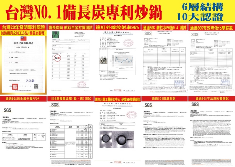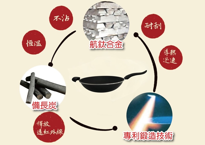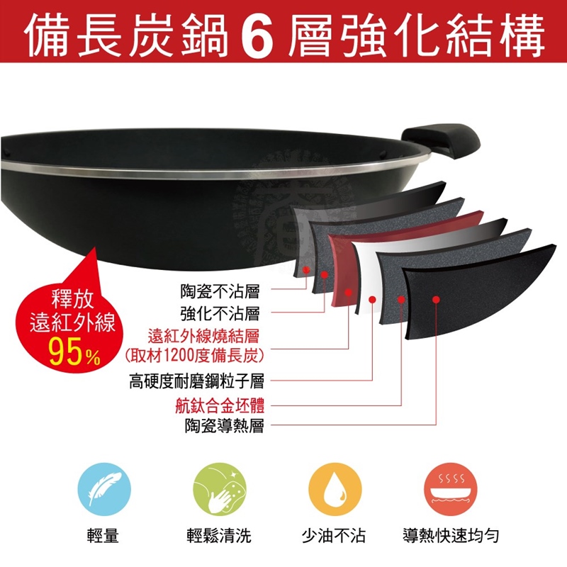 材質:多層複合金強化處理、 備長炭遠紅外線元素、電木把手、不鏽鋼鍋蓋