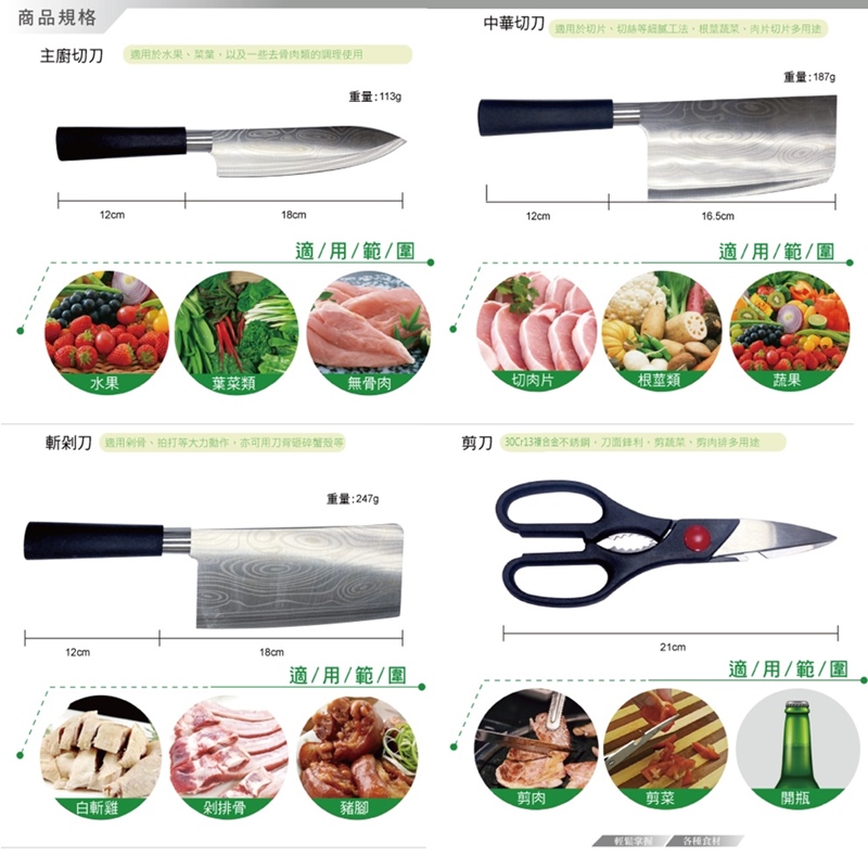 重量:主廚切刀-113g/中華切刀-187g/斬剁刀-247g/料理剪刀-76g