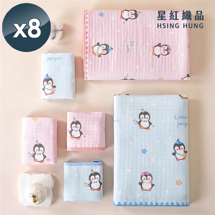 【星紅織品】企鵝家族四層紗布速乾純棉浴巾/童巾/方巾三件套組(粉色/藍色 2色任選)x8組