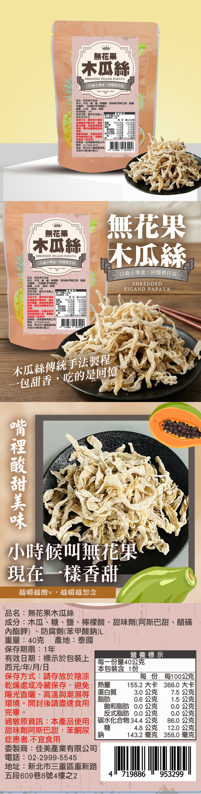 成份:木瓜、糖、鹽、檸檬酸、甜味劑(阿斯巴甜、醋磺內酯鉀) 、防腐劑(苯甲酸鈉)