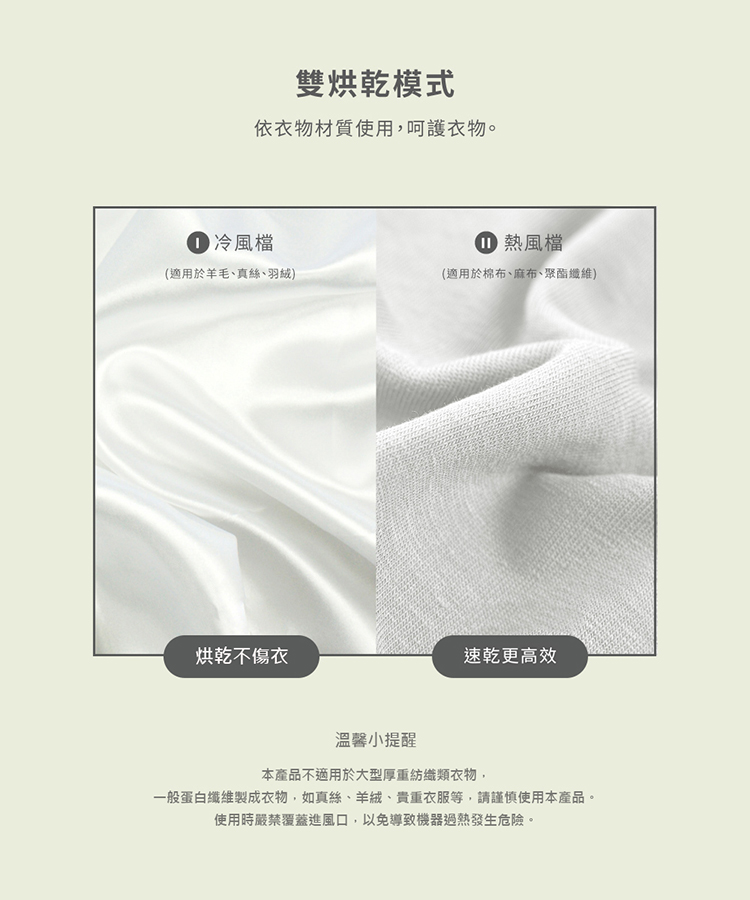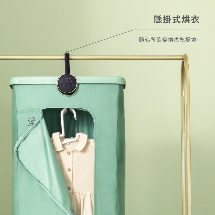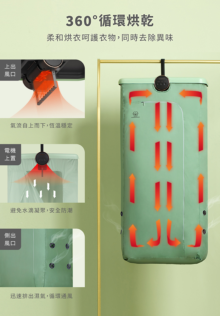 ◆ 榮獲2021年台灣金點設計大獎◆ 360度熱風循環,恆溫氣流柔和烘衣 ◆ 雙重UV消毒,有效除菌/除霉/除臭 ◆ 兩檔溫度模式,搭配各種布料 ◆ 智能定時可達7小時 ◆ 摺疊好收納,輕巧易攜帶 ◆ 懸掛式設計,使用便利 ◆ 外罩纖維柔韌,高效防風防水