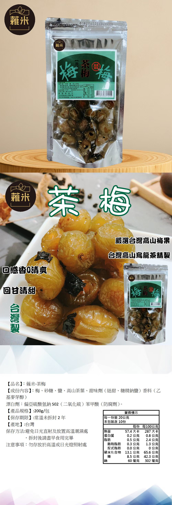 成份: 梅、砂糖、鹽、高山茶葉、甜味劑(紐甜、糖精鈉鹽)、香料(乙基麥芽醇)、偏亞硫酸氫鈉S02(二氧化硫)、苯甲酸(防腐劑)