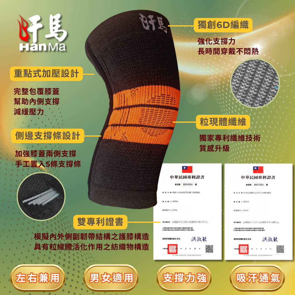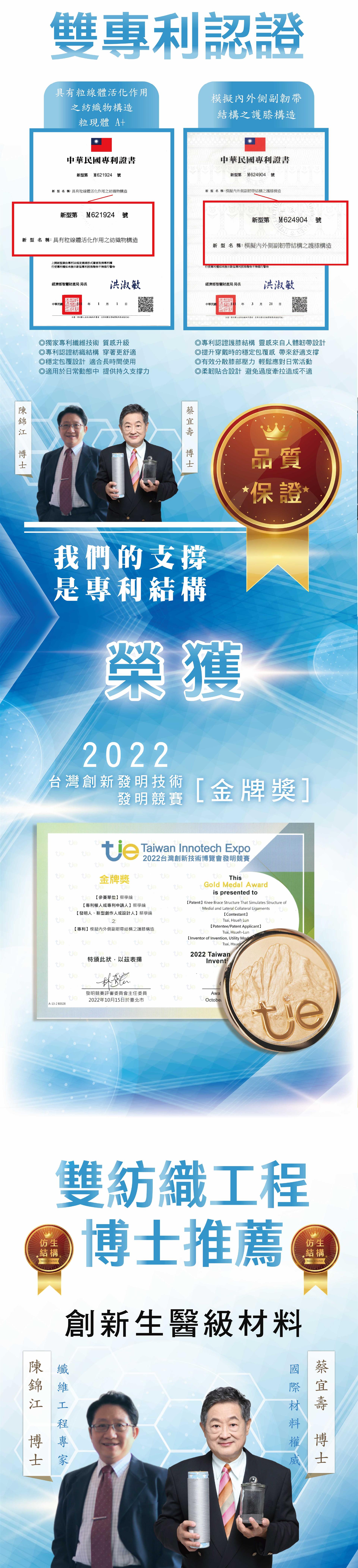 具有雙專利(具有粒線體活化作用之紡織物構造專利證書M621924、模擬內外側副韌帶結構之護膝構造_專利證書M624904)、台灣醫療許可證認證(衛部醫器製壹字第009873號)、台灣設計製造