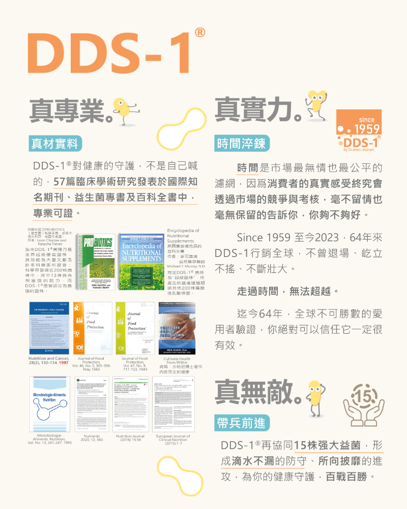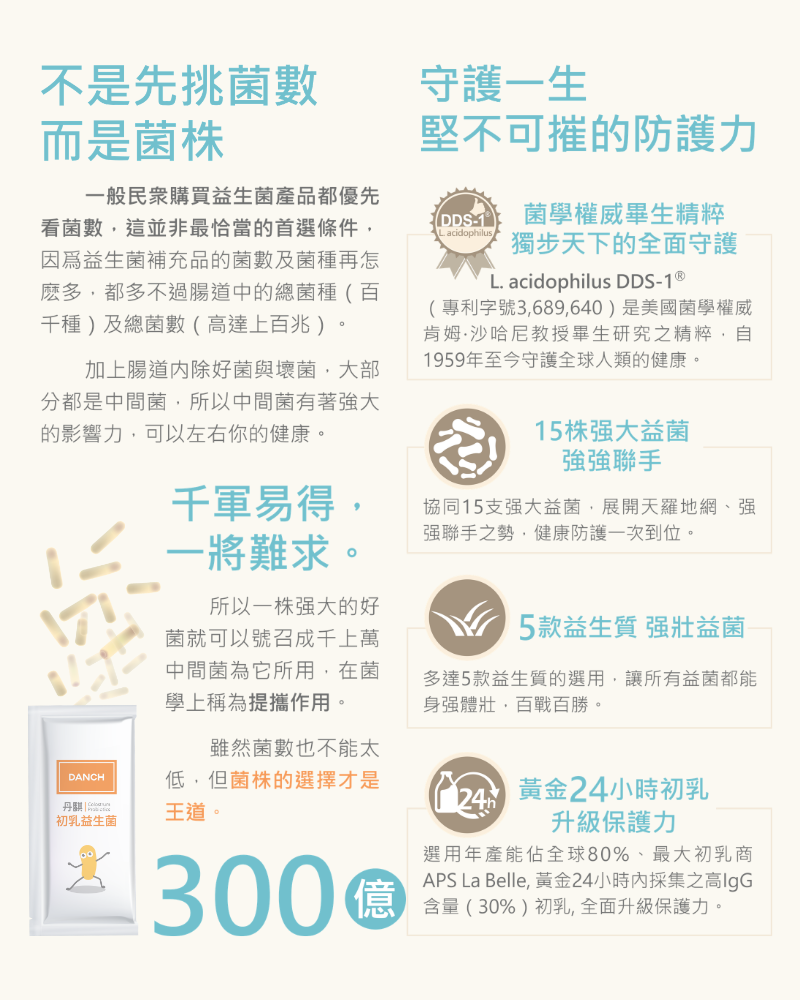 成份:Bimuno R半乳寡糖、FibersolR-2 玉米來源可溶性纖維/難消化性麥芽糊精、Fibryxa?異麥芽糊精、麥芽糊精、APS 30% IgG初乳粉、OraftiR專利菊糖、DDS-1R嗜酸性乳酸桿菌(L.acidophilus DDS-1R)、雙歧桿菌(比菲德氏菌 Bifidobacterium bifidum)、植物乳桿菌 (Lactobacillus plantarum)、乳雙歧桿菌(Bifidobacterium animalis subsp. lactis)、短雙歧桿菌(Bifidobacterium breve)、乾酪乳桿菌(Lactobacillus casei)、副乾酪乳桿菌(Lactobacillus paracasei)、醱酵乳桿菌( Lactobacillus fermentum)、鼠李糖乳桿菌( Lactobacillus rhamnosus)、嗜熱鏈球菌(Streptococcus thermophilus)、凝乳芽孢桿菌(Bacillus coagulans)、嗜酸乳桿菌(Lactobacillus acidophilus)、長雙歧桿菌(Bifidobacterium longum)、德氏乳桿菌乳酸亞種(Lactobacillus delbrueckii subsp. Lactis)、羅伊氏乳桿菌(Lactobacillus reuteri)、瑞士乳桿菌(Lactobacillus helveticus)、微晶纖維素(Microtrystalline α-cellulose)。